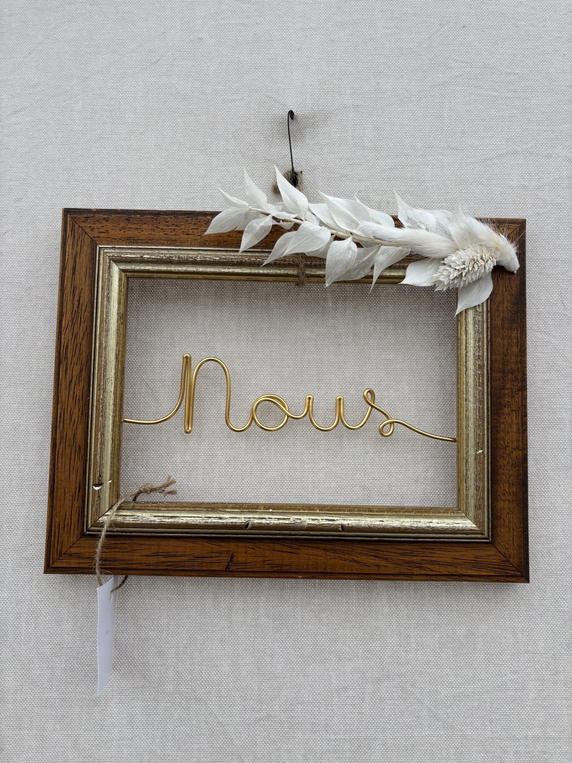 Cadre ancien chiné bois et or, écriture filaire dorée, décoration fleurs séchées